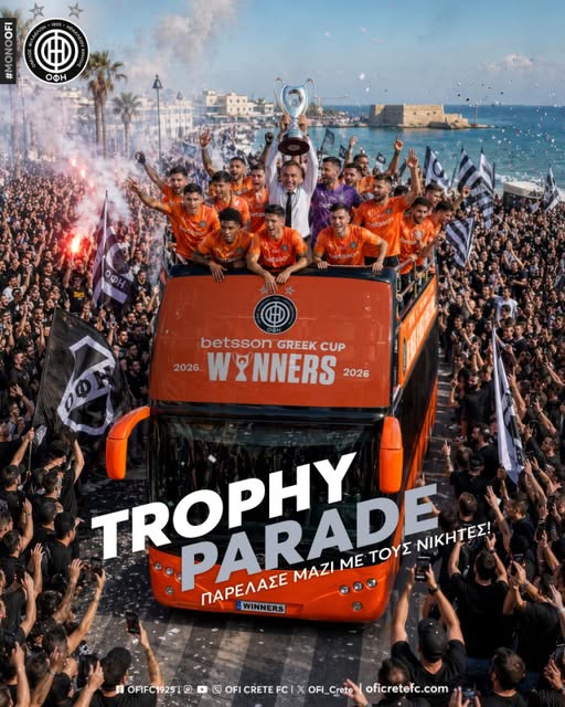 Σήμερα δεν είναι μια συνηθισμένη μέρα. Είναι μέρα γιορτής για όλη την Κρήτη! Οι θριαμβευτές του Βόλου επέστρεψαν στο νησί και το Ηράκλειο βγαίνει στους δρόμους για να αποθεώσει τους Κυπελλούχους Ελλάδας 2026!, αναφέρει η ΠΑΕ ΟΦΗ σε ανακοίνωση της και σύμφωνα με το πρόγραμμα: