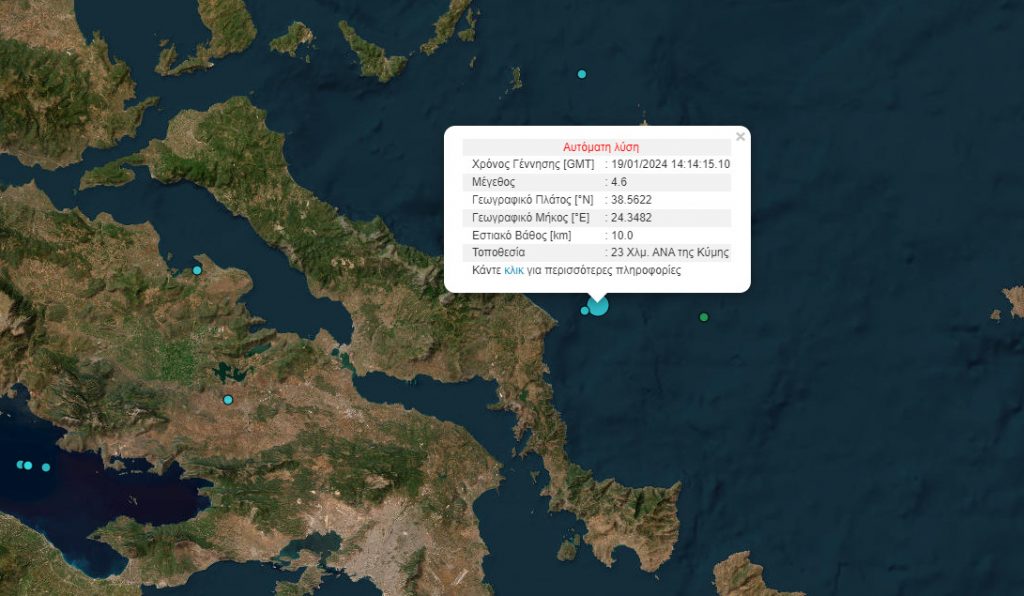 Σεισμική δόνηση 4,6 Ρίχτερ σημειώθηκε το απόγευμα της Παρασκευής 19 Ιανουαρίου ανατολικά της Κύμης, στην Εύβοια.