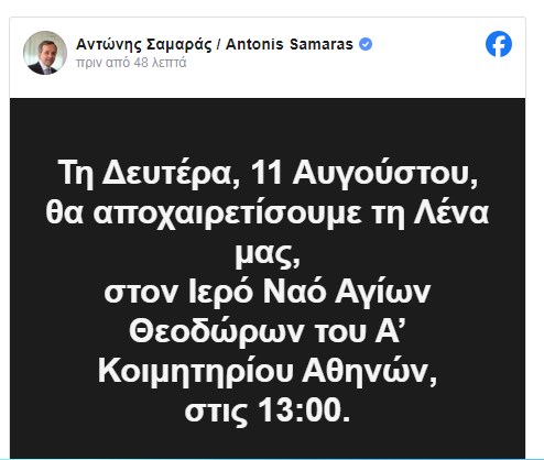 Ο πρώην πρωθυπουργός Αντώνης Σαμαράς, με ανάρτησή του στα μέσα κοινωνικής δικτύωσης, γνωστοποίησε ότι η κηδεία της κόρης του, Λένας,