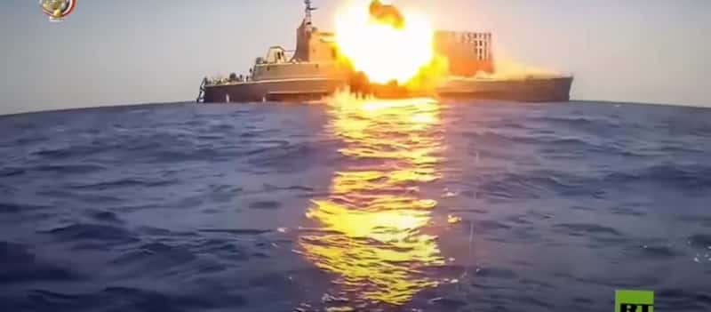 Στιγμιότυπα που δημοσιεύτηκαν από τις Αιγυπτιακές Ένοπλες Δυνάμεις το απόγευμα του Σαββάτου αποτυπώνουν τη στιγμή που το Ναυτικό τους βύθισε «εχθρικό» πλοίο στη Μεσόγειο, κοντά στη Λιβύη, με ένα χτύπημα δέιχνοντας έτσι πλέον ότι το Κάιρο είναι έτοιμο για μια σύγκρουση ακόμα και στην θάλασσα της Μεσογείου αν απαιτηθεί έναντι κάθε απειλής που άπτεται των κυριαρχικών της δικαιωμάτων με προφανή στόχο τον τουρκικό στόλο.