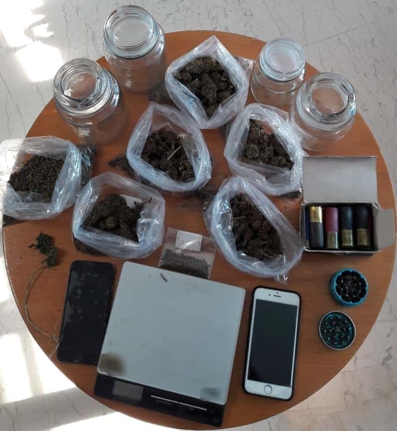 Κατά την διάρκεια της έρευνας βρέθηκαν και κατασχέθηκαν: 238,5 γραμμάρια κάνναβης, δενδρύλλιο κάνναβης εκριζωμένο, ζυγαριά ακριβείας, μεταλλικός θρυμματιστής κάνναβης, 2 κινητά τηλέφωνα και φυσίγγια.