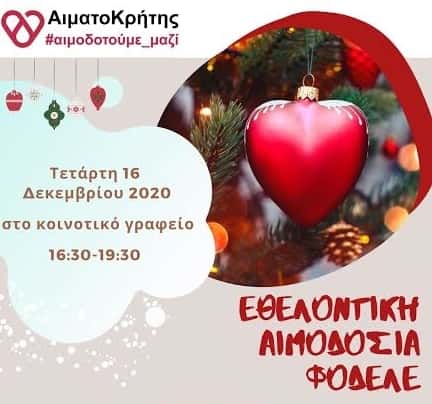Εθελοντική Αιμοδοσία θα πραγματοποιηθεί τη Τετάρτη 16/12/2020 στον προαύλιο χώρο του κοινοτικού γραφείου Φόδελε και ώρες 16:30 – 19:30. Την αιμοδοσία διοργανώνει ο Παγκρήτιος Σύνδεσμος Εθελοντών Αιμοδοτών και Δωρητών Οργάνων Σώματος «Αιματοκρήτης» στα πλαίσια του προγράμματος «αιμοδοτούμε_μαζί», σε συνεργασία με το Σύλλογο Γονέων και Κηδεμόνων, τον Πολιτιστικό Σύλλογο και το Τοπικό Συμβούλιο Φόδελε. Οι αιμοληψίες θα πραγματοποιηθούν από την κινητή μονάδα αιμοδοσιών του ΠΑΓΝΗ.