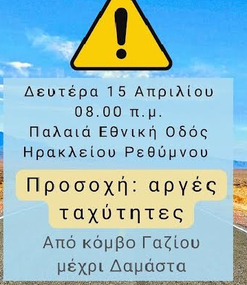 Οι οδηγοί που θα κινούνται στην παλαιά Εθνική Οδό Ηρακλείου – Ρεθύμνου, από τον κόμβο Γαζίου μέχρι και τη Δαμάστα, θα πρέπει να είναι πολύ προσεκτικοί, να ακολουθούν τις οδηγίες όσων θα ρυθμίζουν την κυκλοφορία και να γνωρίζουν πως η κυκλοφορία των οχημάτων θα διεξάγεται, κατά διαστήματα, με πολύ αργή ταχύτητα.
