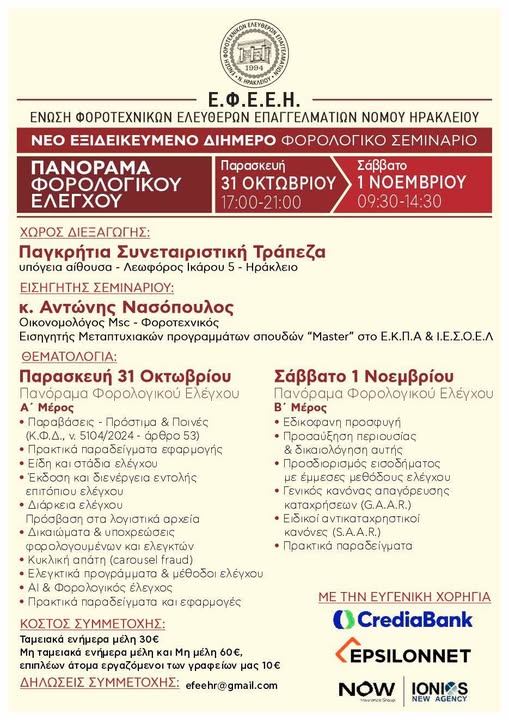 “Πανόραμα Φορολογικού Ελέγχου”: Από αύριο η εκδήλωση της Ένωσης Φοροτεχνικών Ελευθέρων Επαγγελματιών Ν. Ηρακλείου