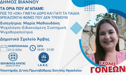 Η Περιφέρεια Κρήτης, το Ινστιτούτο Ανθρωπιστικών και Κοινωνικών Επιστημών (ΙΑΚΕ) σε συνεργασία με τον Δήμο Βιάννου, πραγματοποιούν συνάντηση στο πλαίσιο του 2ου κύκλου της Σχολής Γονέων, την Τετάρτη 25 Φεβρουαρίου 2026 και ώρα 18:00 - 21:00 στο Δημοτικό Σχολείο Άρβης. Η συνάντηση θα έχει ως θέμα «Τα όρια που αγαπάμε: Πώς το ‘’όχι’’ γίνεται δώρο και γιατί τα παιδιά χρειάζονται φωνές που δεν τρέμουν» με εισηγήτρια την παιδοψυχολόγο κα Μαρία Μαθιουδάκη.