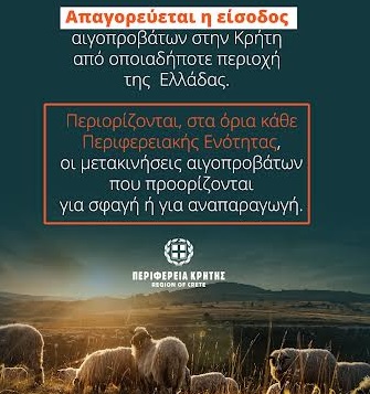 Απαγόρευση Εισόδου: Εξακολουθεί να ισχύει η απαγόρευση εισόδου αιγοπροβάτων στην Κρήτη από εκτροφές της υπόλοιπης Ελλάδας.