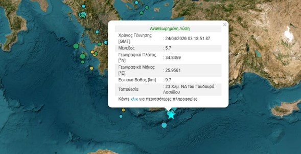 Μεγάλη αναστάτωση προκάλεσε στην Κρήτη σεισμική δόνηση μεγέθους 5,7 βαθμών της κλίμακας Ρίχτερ, που σημειώθηκε λίγο πριν από τις 06:30 το πρωί σε θαλάσσια περιοχή, 23 χιλιόμετρα νοτιοδυτικά του Γούδουρα Σητείας.
