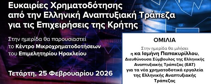 Σήμερα, Τετάρτη 25/2, η εκδήλωση «Ευκαιρίες χρηματοδότησης από την Ελληνική Αναπτυξιακή Τράπεζα για τις επιχειρήσεις της Κρήτης» στο Επιμελητήριο Ηρακλείου