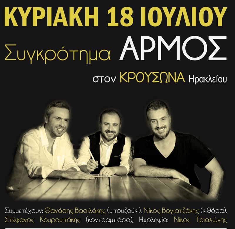 Μετά από έναν δύσκολο χειμώνα, σύμφωνα με τους διοργανωτές, οι Αρμός – το γνωστό συγκρότημα από το Ηράκλειο της Κρήτης – με την πλούσια δισκογραφία και τις συνεργασίες με σπουδαίους και καταξιωμένους καλλιτέχνες και με αφορμή την επέτειο του ολοκαυτώματος του ναού του Αγίου Χαραλάμπους στις 18 Ιουλίου 1822, θα εμφανιστούν στον Κρουσώνα, ενώ δεν θα λείψει μια ιδιαίτερη μουσική αναφορά στην ιστορική αυτή επέτειο.