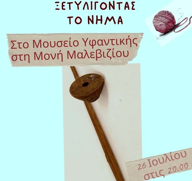 Μία εκδήλωση αφιερωμένη στην υφαντική τέχνη και την παράδοση της, διοργανώνει ο Δήμος Μαλεβιζίου σε συνεργασία με τον Πολιτιστικό Σύλλογο Μονής στο Μουσείο Υφαντικής την Δευτέρα 26 Ιουλίου στις 20.00.