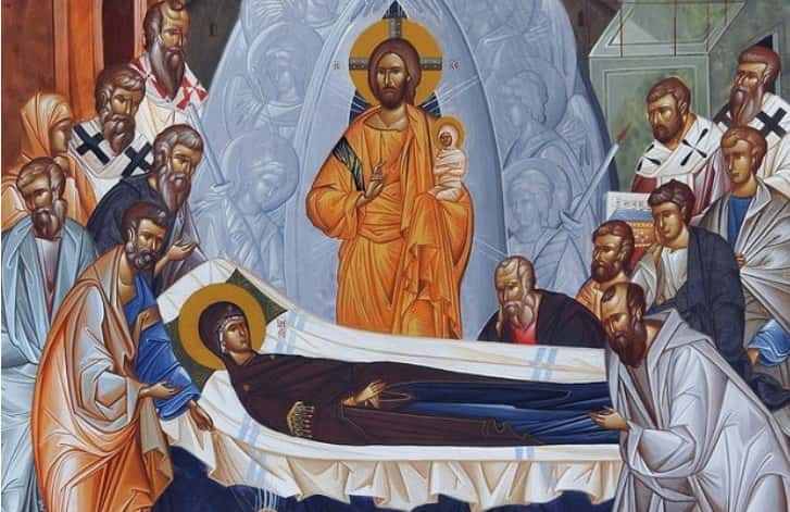 Έτσι, λοιπόν, κατά την εκκλησιαστική παράδοση, η μητέρα του Ιησού Χριστού, Μαρία (η Θεοτόκος και Παναγία), πληροφορήθηκε τον επικείμενο θάνατό της από έναν άγγελο τρεις ημέρες προτού αυτός συμβεί και άρχισε να προετοιμάζεται κατάλληλα. Προσεύχεται στο όρος των Ελαιών και δίνει τα υπάρχοντά της σε δύο γειτόνισσές της χήρες. Επειδή κατά την ημέρα της Κοίμησής της δεν ήταν όλοι οι Απόστολοι στα Ιεροσόλυμα, καθώς κήρυτταν «απανταχού γης», μία νεφέλη τους άρπαξε και τους έφερε κοντά της. Μοναδικός απών ο απόστολος Θωμάς.