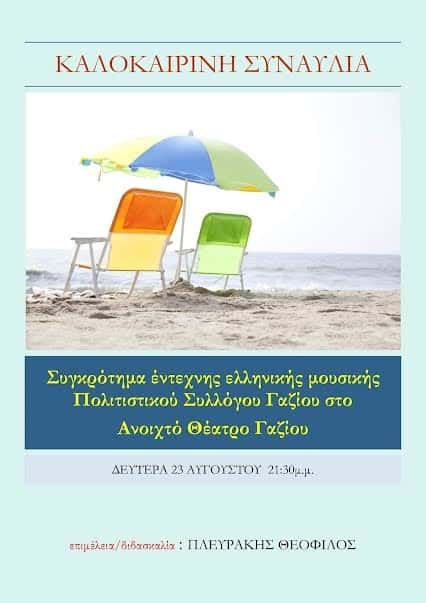 Με συναυλία από το συγκρότημα έντεχνης ελληνικής μουσικής του Πολιτιστικού Συλλόγου Γαζίου συνεχίζονται τη Δευτέρα 23 Αυγούστου οι Πολιτιστικές Εκδηλώσεις του Δήμου Μαλεβιζίου.