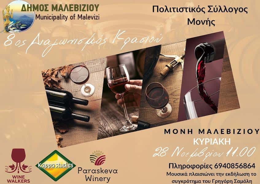 Ο Δήμος Μαλεβιζίου σε συνεργασία με τον Πολιτιστικό Σύλλογο Μονής διοργανώνουν την Κυριακή 28 Νοεμβρίου τον 8ο Διαγωνισμό Κρασιού φετινής σοδειάς.
