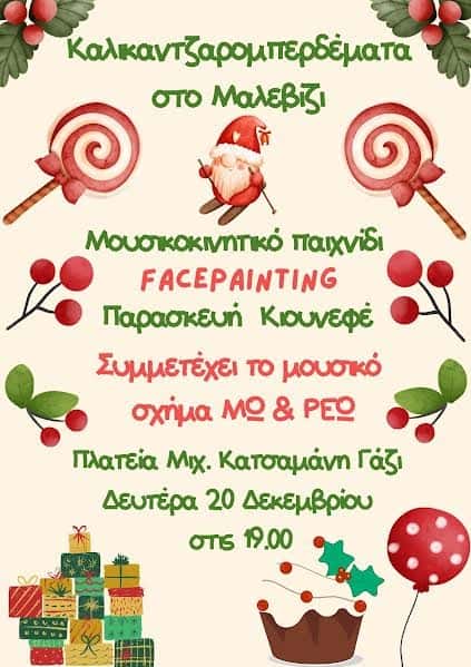 Σήμερα το απόγευμα στις 19.00 θα πραγματοποιηθεί η Χριστουγεννιάτικη Εκδήλωση για παιδιά με τίτλο «Καλικαντζαρομπερδέματα» που οργανώνει ο Δήμος Μαλεβιζίου στην πλατεία Μιχ. Κατσαμάνη στο Γάζι