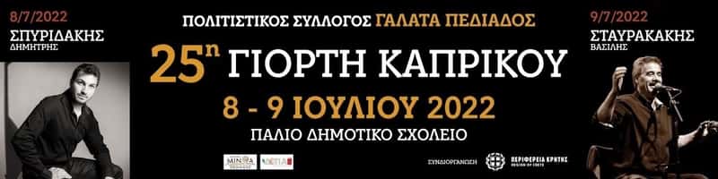 Ο Πολιτιστικός Σύλλογος Γαλατά Πεδιάδος, με την στήριξη της Περιφέρειας Κρήτης, διοργανώνει την 25η γιορτή Καπρικού, μία γιορτή θεσμός, όπου οι επισκέπτες θα δοκιμάσουν τη θεσπέσια γεύση του Καπρικού του Γαλατά.