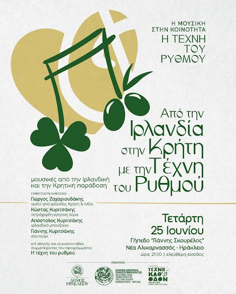 20:30 «Από την Ιρλανδία στην Κρήτη με την τέχνη του ρυθμού»: με μουσικές παραδόσεις της Ιρλανδίας και της Κρήτης. Οι συμμετέχοντες του προγράμματος «Η Τέχνη του ρυθμού στην εκπαίδευση – Η Μουσική στην Κοινότητα», συμπράττουν επί σκηνής με τους μουσικούς Κώστα Κυριτσάκη (τετράχορδη κρητική λύρα), Κώστα Μακάκη (κρητικό λαούτο) και Γιώργο Ζαχαριουδάκη (αυλοί)