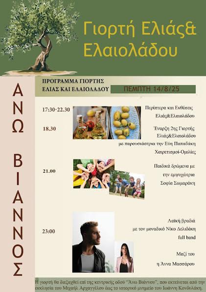 Μια διήμερη γιορτή που γίνεται θεσμός για την περιοχή και διοργανώνεται την Πέμπτη 14 και την Παρασκευή 15 Αυγούστου 2025 από τον Πολιτιστικό Σύλλογο Άνω Βιάννου, με τη στήριξη του Δήμου Βιάννου και με στόχο να βρεθεί το λάδι στο επίκεντρο του ενδιαφέροντος.