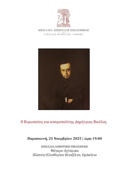 «Ο Ευρωπαίος και κοσμοπολίτης Δημήτριος Βικέλας», είναι το θέμα της εσπερίδας που διοργανώνεται από τη Βιβλιοθήκη της Βουλής των Ελλήνων σε συνεργασία με τη Βικελαία Δημοτική Βιβλιοθήκη, στο πλαίσιο της έκθεσης με τίτλο «Ο πολυταξιδεμένος Δημήτριος Βικέλας». Η εσπερίδα θα πραγματοποιηθεί την Παρασκευή, 21 Νοεμβρίου, στις 19:00 το απόγευμα στην αίθουσα «Θεοτοκόπουλος» της Βικελαίας.