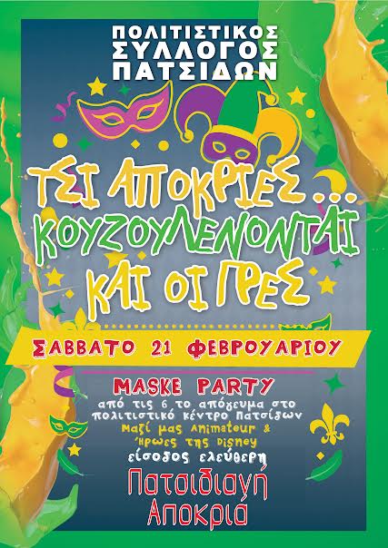Το μεγάλο μασκέ πάρτυ στο Πολιτιστικό Κέντρο Πατσίδων με χορό παιχνίδια δράσεις ξεφάντωμα μουσική και αποκριάτικη διάθεση!Να ξεφύγουμε από την καθημερινότητα και ότι μας απασχολεί! Στην παρέα μας τα ζωάκια της ζούγκλας,οι ήρωες της Ντίσνευ με τον animater τους με πολλές δραστηριότητες και παιχνίδια για μικρά και μεγάλα παιδάκια !!!! Μουσική με τους καλύτερους D.J.......ΤΣΙ ΑΠΟΚΡΙΕΣ....ΚΟΥΖΟΥΛΕΝΟΝΤΑΙ ΚΑΙ ΟΙ ΓΡΕΣ!!!!!