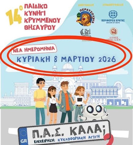 Φέτος η ομάδα «Περατζούνια» και η Ακαδημία των “ALLEGRI” υπό την αιγίδα του Δήμου Ηρακλείου και την συνδιοργάνωση της Περιφέρειας Κρήτης, καλεί τα παιδιά της Ε’ και ΣΤ’ Δημοτικού στο «Π.Α.Σ. ΚΑΛΑ;»- Επιχείρηση: Κυκλοφοριακή Αγωγή. Το Παιδικό Κυνήγι Κρυμμένου Θησαυρού αποτελεί μια μοναδική ευκαιρία για τα παιδιά να αναπτύξουν την ομαδικότητα, τη συνεργασία και την παρατηρητικότητά τους μέσα από διασκεδαστικές και εκπαιδευτικές δραστηριότητες. Κατά τη διάρκεια του παιχνιδιού, τα παιδιά θα κληθούν να λύσουν γρίφους και να ακολουθήσουν ενδείξεις για να ανακαλύψουν τον κρυμμένο θησαυρό, βιώνοντας μια αξέχαστη εμπειρία.