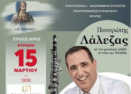 Ο Πολιτιστικός και Λαογραφικός Σύλλογος Πελοποννησίων Ηρακλείου Κρήτης «Ο Μοριάς», σε συνδιοργάνωση με την Περιφέρεια Κρήτης, προσκαλεί τα μέλη του και όλους τους φίλους της ελληνικής παράδοσης στον ετήσιο χορό του, την Κυριακή 15 Μαρτίου και ώρα 13:00, στον ιδιαίτερα φιλόξενο χώρο του Κτήματος - Πύλη Βιτούρι (πρώην Πέτρινος Πύργος), στον Καρτερό Ηρακλείου.